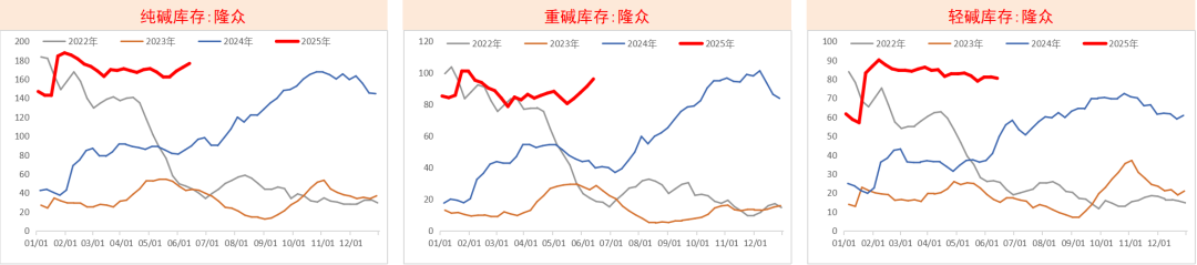 高产量下,纯碱库存历史最高水平。其中重碱库存有加速上升趋势。