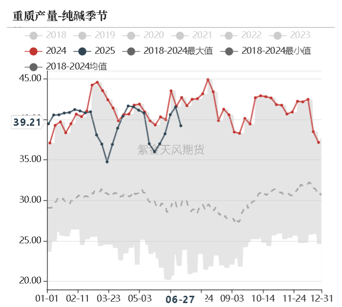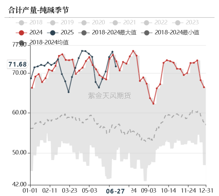 上半年,纯碱产量持平去年,周产71.4万吨,其中重碱减产4%,周产39.6万吨,周产轻碱增产5.3%,周产31.85万吨。