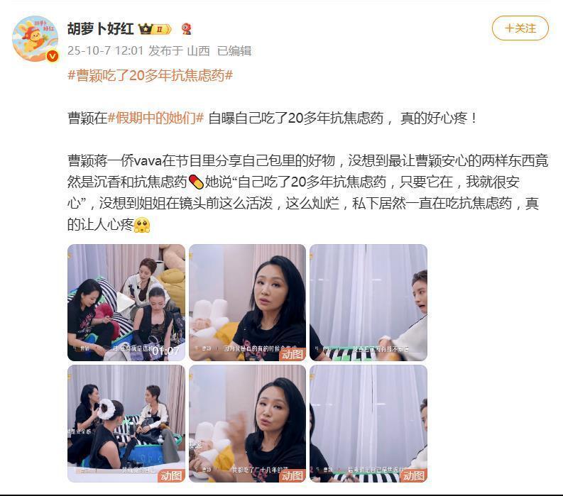 10 月 8 日,有网友爆料,在近期热播的综艺《假期中的她们》中,曹颖首次公开揭开自己长达二十年的抗焦虑疮疤——一个随身携带的药盒,成了她最重要的“安全感来源”。当她在镜头前平静展示药盒并说出“只要它在,我就很安心”时,观众才意识到,这位曾以《莞香》《天仙配后传》等作品闪耀荧屏的“金鹰奖视后”,背后竟是一场与精神疾病持续缠斗的生存实录。
